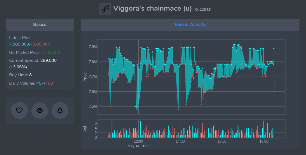 When a buyer places a new bid greater than the lowest-priced existing ask from a seller, the Grand Exchange then executes a trade between those players at the price of the ask. Similarly, when a seller places a new ask lower than the highest-priced existing bid from a buyer, a trade goes through between those players at the price of the bid. The highest-priced buyers’ bid and the lowest-priced sellers’ ask are called the margins. The gap between them is called the spread, and measures the potential profit to be made by flipping an item (ignoring tax).