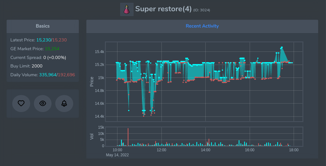 You can run a test to find these margins yourself, by placing a bid on an item high enough that you buy it instantly. This gives you the “sell price” of an item, meaning the threshold at which the item instantly sells. Then, take the same item, and sell it at a low enough price that it sells instantly to find the “buy price”. (Hint: if you get confused between “buy price” and “sell price”, add an “insta-” prefix to them in your head.) This process is called a price check. You’ll lose money by price-checking, but if you plan to trade a high volume of a particular item, running this test can serve as valuable reconnaissance. When trading expensive items, using a Grand Exchange market database tool like RuneCapital can save you the difficulty and cost of running price checks manually.